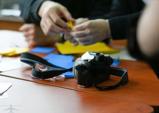 書道体験、吉田先生担当。ウクライナへ千羽鶴プロジェクト、折り鶴と日本の戦争から生まれた千羽鶴の歴史紹介 A先生の素晴らしいスライド。日本人が日本語で説明 その後 ポーランド語に日本語選択の生徒が翻訳。プレゼン後 折り鶴体験。
