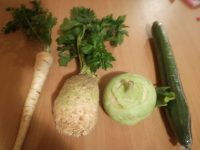 こちらの野菜です。 パンケーキの大きさに仰天 パセリの根、セロリの根を食べます。 キュウリ、ハンガリーのカブのようなコロラビです。