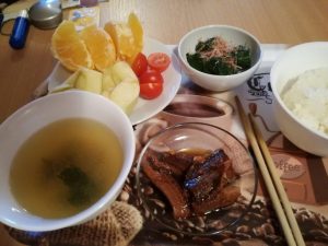 今日から店も閉まるので、昨日学校に行く前に、隣のスーパーに行きました。そこで大きな袋に入った 柔らかそうな新鮮なホーレン草を見つけ、急いでゆでておひたしにし、サンマのかば焼きの缶詰を開けて、本当に久しぶりに和食の朝食を味わいました。こちらは果物は安いので(大きなオレンジ1こ50円以下、大きなブドウひと房200円位、、、)食べ放題です 。