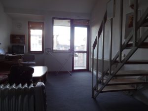 寮の部屋の窓からツァラベッツの丘を望む 入り口から部屋の中を見る