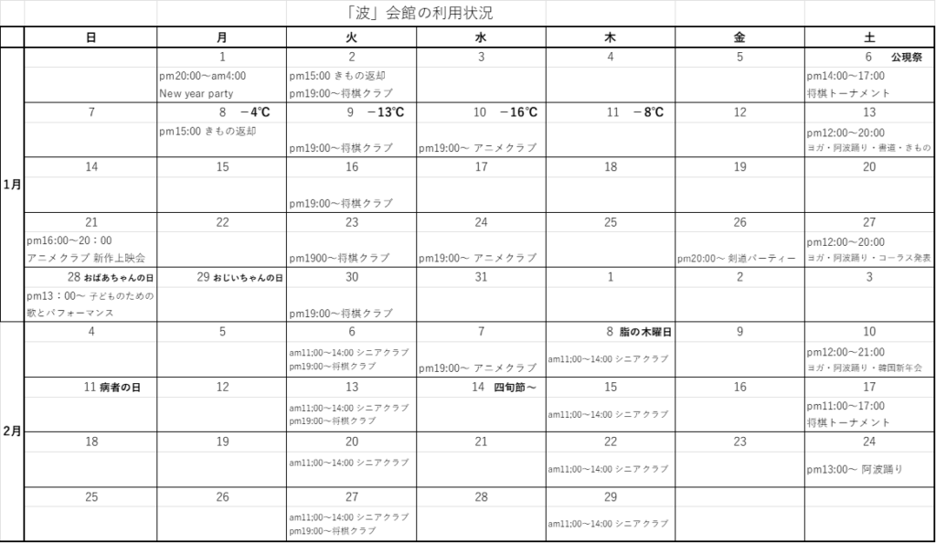 〈生活のその後〉 設備全体が老朽化しているからだろう、暖房の効きが弱いことがあった。部屋ごとに温度差があるが、ダイニングルームが20℃にならないこともあった。そんなときは移動式のパネルヒーターを追加で使用した。上旬の寒波が収まってからは暖房は順調だが、シャワーがぬるくて難渋したこともあった。トイレの流れが不具合だったことも、洗濯機への配線が途絶え使えなくなることもあった。いつまた不具合が起こるのかとの不安がある。12/21(木)の夜には1時間程度の断水があった。 10月の報告でも述べたように、ここでの生活ではプライバシーの確保が大きな課題である。活動場所と住まいが同じであることがその理由である。大勢の方が活発に活動することで、そこに居住している日本人ボランティアの空間が制限されてしまう。大勢の方が活動しているときは、ダイニングムールに居続けるのも気が引けて、自室に引き上げることとなる。もちろん、キッチンやトイレはいつも通り使用可能ではあるが使用に際してどうしても気兼ねをしてしまう。 この建物とは別の所に独立した住まいがあればと考える。「波」で日本人ボランティアがこれから継続的に活動していくためには必要なことだと思う。