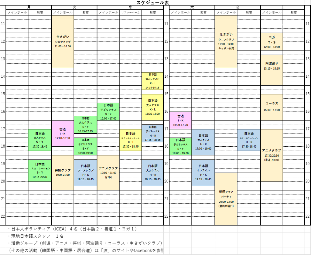 「波」では多岐にわたる活動が展開されている。剣道(名称:龍心会)・アニメ・将棋・シニアグループ(名称:生きがい)・阿波踊り(名称:波連)・コーラス(名称:歌いましょう)・居合道(名称:錬心会)のグループがある。日本における市民講座とか公民館活動と通うものがある。その熱心さに驚かされてしまう。活動の概要は次のようになる。