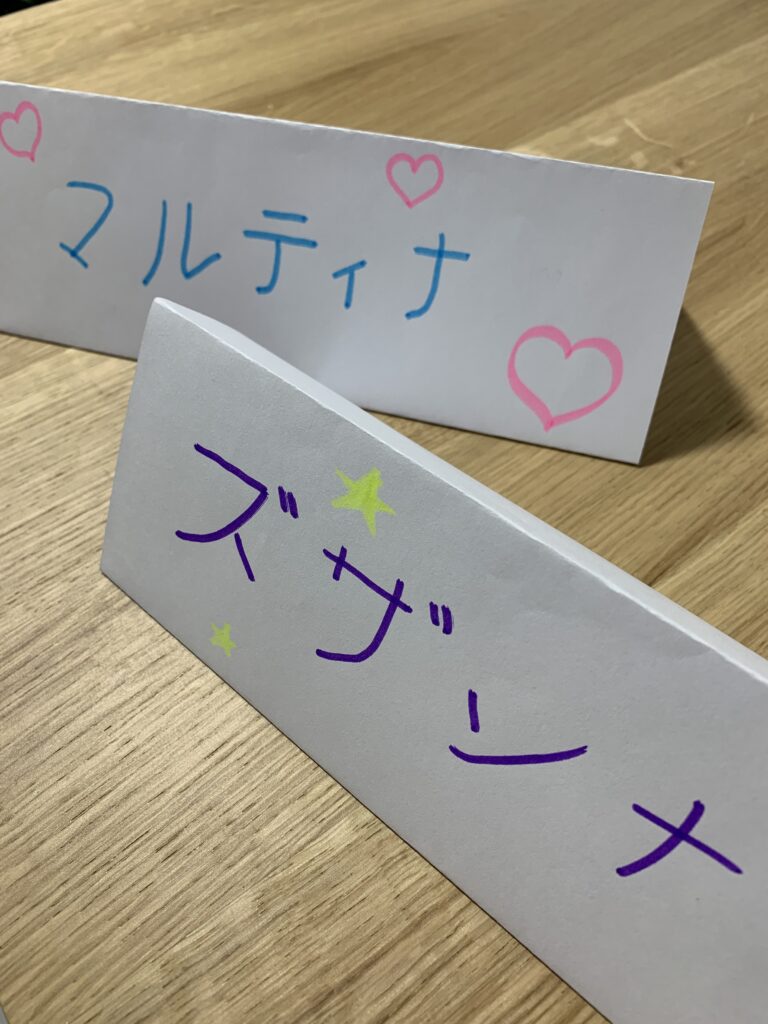 入門クラスは、ひらがな・カタカナがまだよくわからないけどがんばるという学生、すでに先の文法や漢字を学び始めている学生などレベルに差もできてはいますが、クラスのメンバーでフォローし合えるような授業づくりを心掛けています。先日、カタカナを一通り終えたので、ようやくネームカードを自分で作ってもらいました。初級1年、2年のクラスは文法を確実に理解していこうという姿勢が見られます。