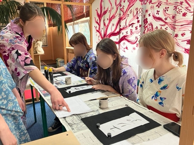 ウッジ第二高校に赴任されているアイセアの先生に招待していただき、日本語の授業を受けている生徒が来校者の名前をカタカナで書くためのお手伝いをしました。浴衣や着物を着て筆を握り、一生懸命カタカナを書く生徒の姿はとても微笑ましいものでした。