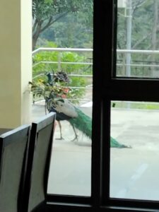 さて、ここIIITDMJはジャバルプル市街から10数キロ離れ、周りにはほとんどなにもないのですが、学園内には小さなキャンティーンが二つと大食堂がひとつあり病院や銀行もあって、午後からは定期バスも運行しています。ちょっとした買い物はアルコール以外ならほとんど学園内でできますが、電子機器やあまり日常的でないものは、バスで町まで買いに行きます。また、ここ来客用ホステルから校舎までは歩いて数分、有料ですが食事も毎度ここでできるので、生活上は不便はありません。授業のないときや朝などよく学園内を散歩してますが、多くの鳥たちや猿を見かけます。特に孔雀は多くて何度もカメラを向けました。食堂のガラス戸のところまで来ることもあります。ここでは生活が単調なので、いろんな動植物との出会いは日々の楽しみでもあります。