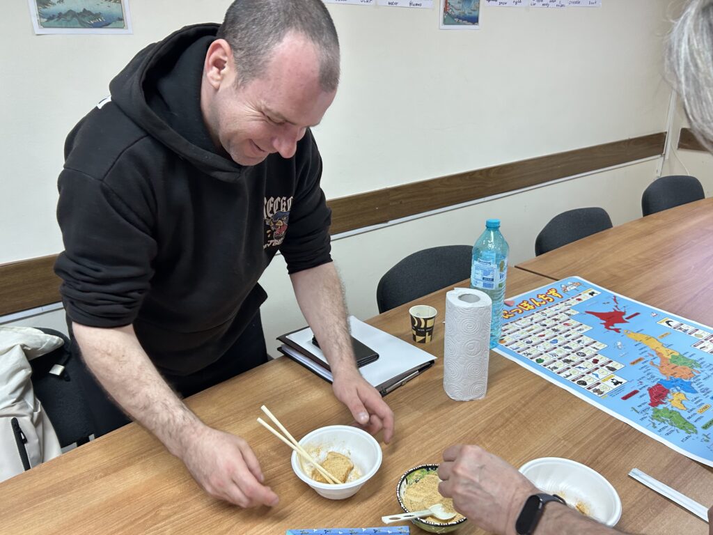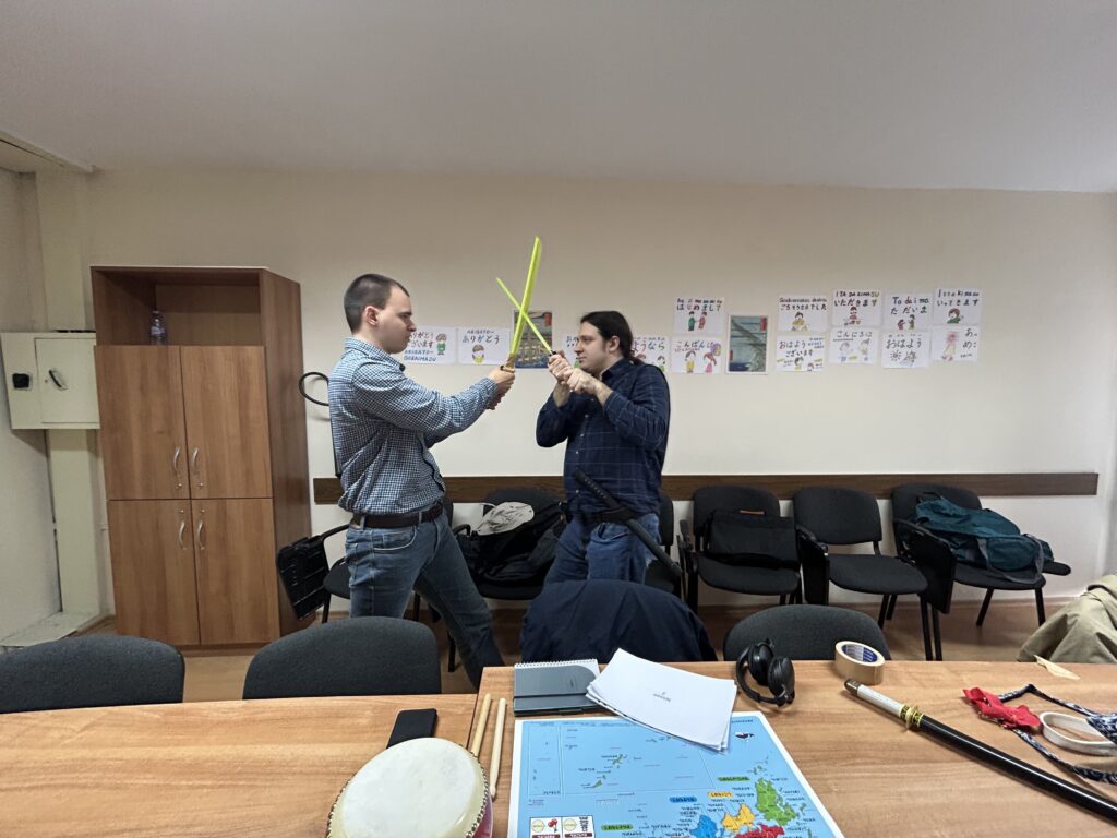 3月のレッスンも月曜から金曜日まで毎日16時から行いました。しかし、誰も来ない日もありました。延べ人数で10人から15人ぐらいでした。テキストはGENKIを使っていましたが、飽きてきているようなので、TRYに変えました。学校のレッスンで来れない生徒は、別の時間に個別で教えはじめました。昨年は、ひらがなを覚える人が非常に少なかったですが、今は、家でひらがなやカタカナを覚える生徒も現れています。週に数回くる生徒もいます。日本文化では、殺陣や切り絵、きな粉餅やあんこを食べる体験もしてもらいました。(下記写真 殺陣、きな粉、切り絵です。
