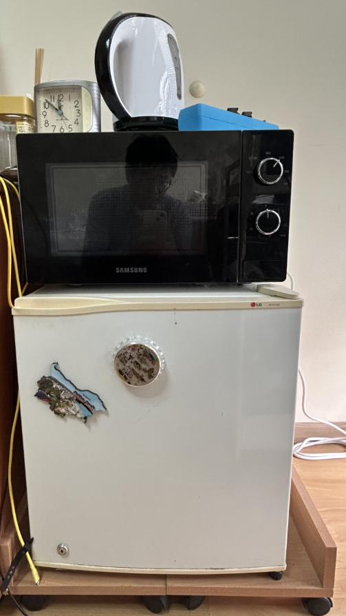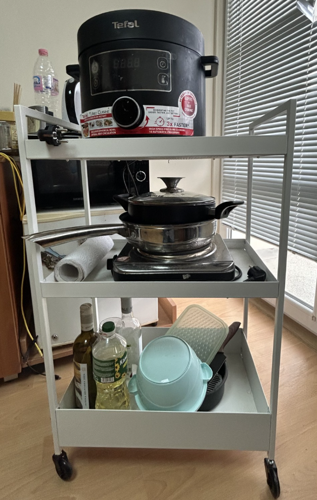 小さな冷蔵庫、ご飯を炊く圧力釜、電気コンロ、オープンレンジ、電気ケトルがあります。鍋、フライパン、小さなまな板、包丁、皿大小、おおきめの器、パスタ用水切りボールで、チャーハン、カレー、パスタなどを作っています(簡単なものばかりです)洗い場は、シャワールームしかないです。これが不便です。料理をするところは、キャスター付きのテーブルの上で行っています。学校にも月曜から金曜日(時々土曜日も)食堂があり、テイクアウトもできます。私は、日本から食材(パスタ用、チャーハン用、牛丼など即席で作れるもの)を持ってきて作っています。