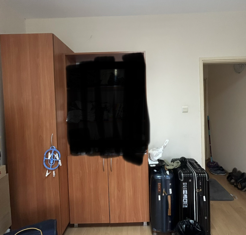 メインの部屋には、ベッド、机、小さなキャスター付きの棚(ベットのよこにあるもの)、大きな棚と横に服を入れる棚があります。