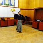 戸川先生は、袴姿になって、紙芝居の朗読と、「黒田節」の踊りを見せてくれたので、生徒たちは大喜びでした。
