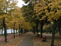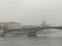 写真: ドナウに浮かぶマルギット島から、雨に煙る国会議事堂、黄葉の並木道。