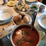 それから重なっているお皿をどけて、サラダやメイン料理を取ります。汁物とご飯を交互に食べる日本とは違うので、それには少し戸惑いました。