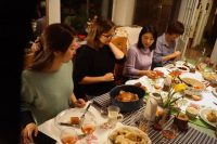 先日作った大量のピエロギがあるので、ご近所さん招いて夕食会をすることに。メイン料理はバーシャさんのチキンの丸焼き。和食店の娘モモちゃんが取り分けます。