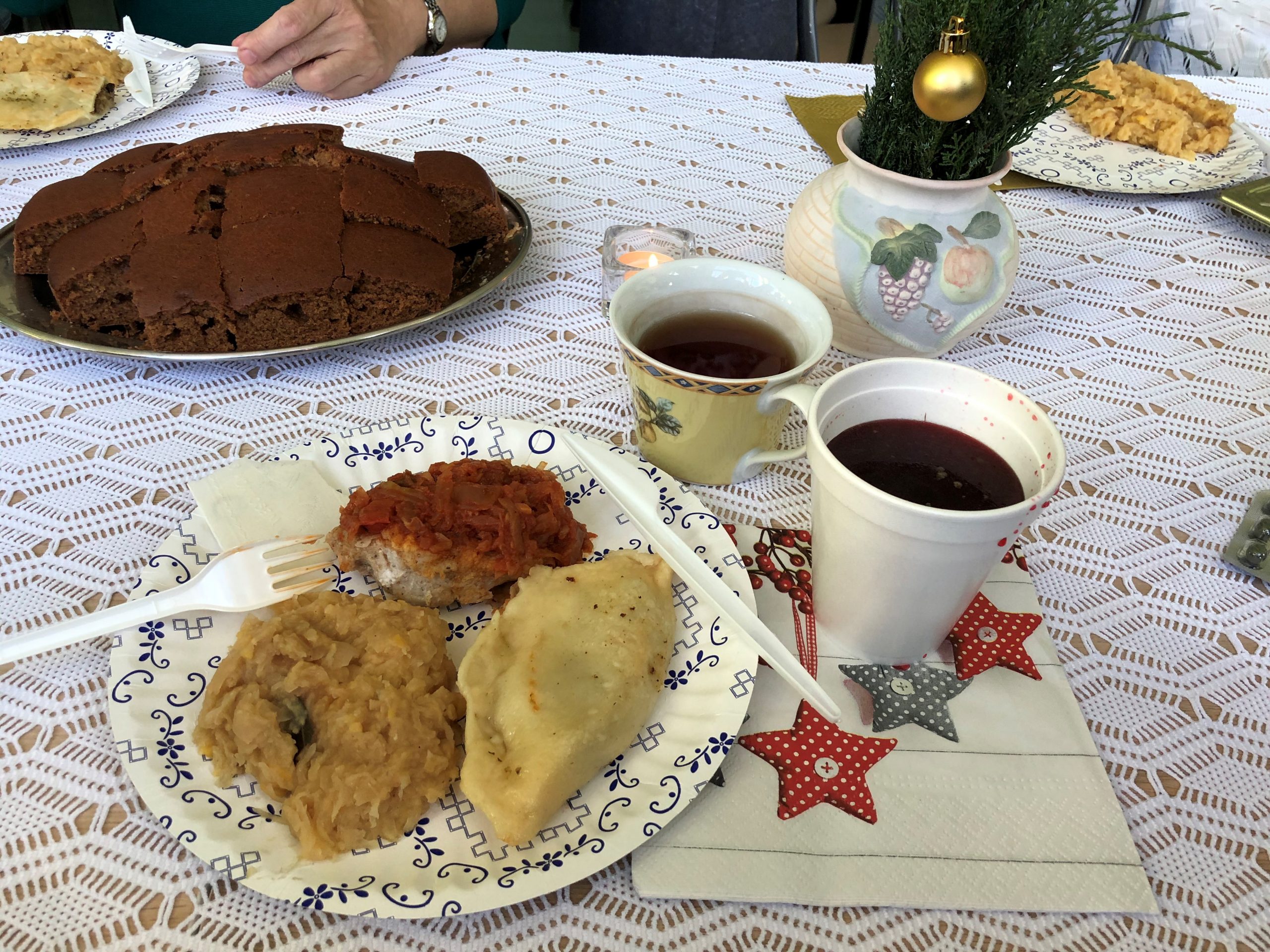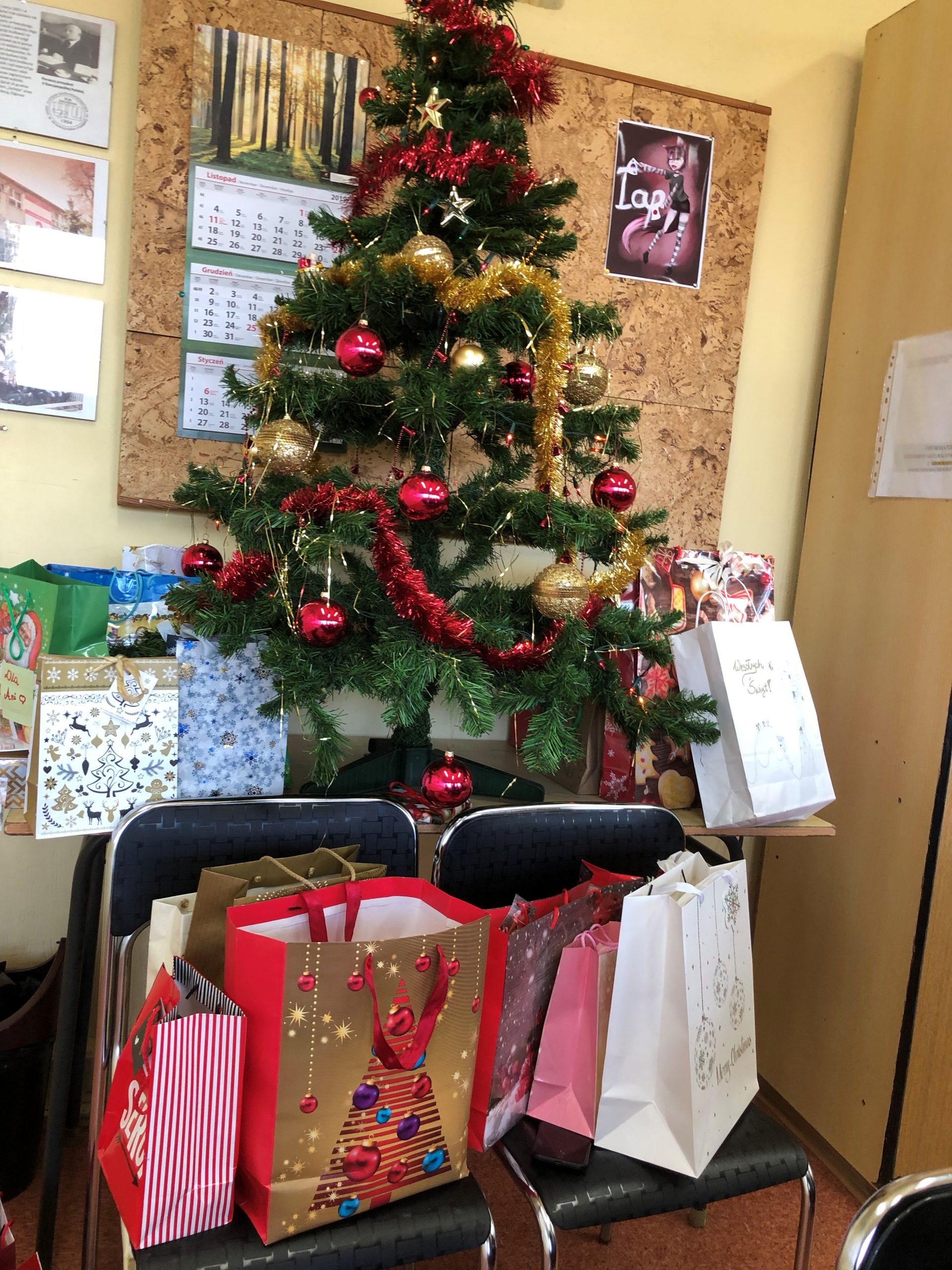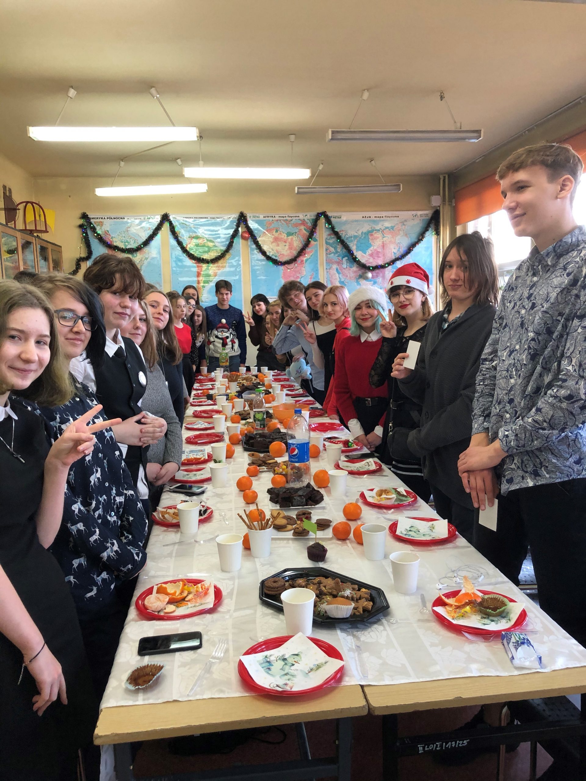 教室にはクリスマスツリーが飾られ、ツリーの下にはプレゼント、テーブルには生徒たちが作ってきたピエロギやスイーツがありました。