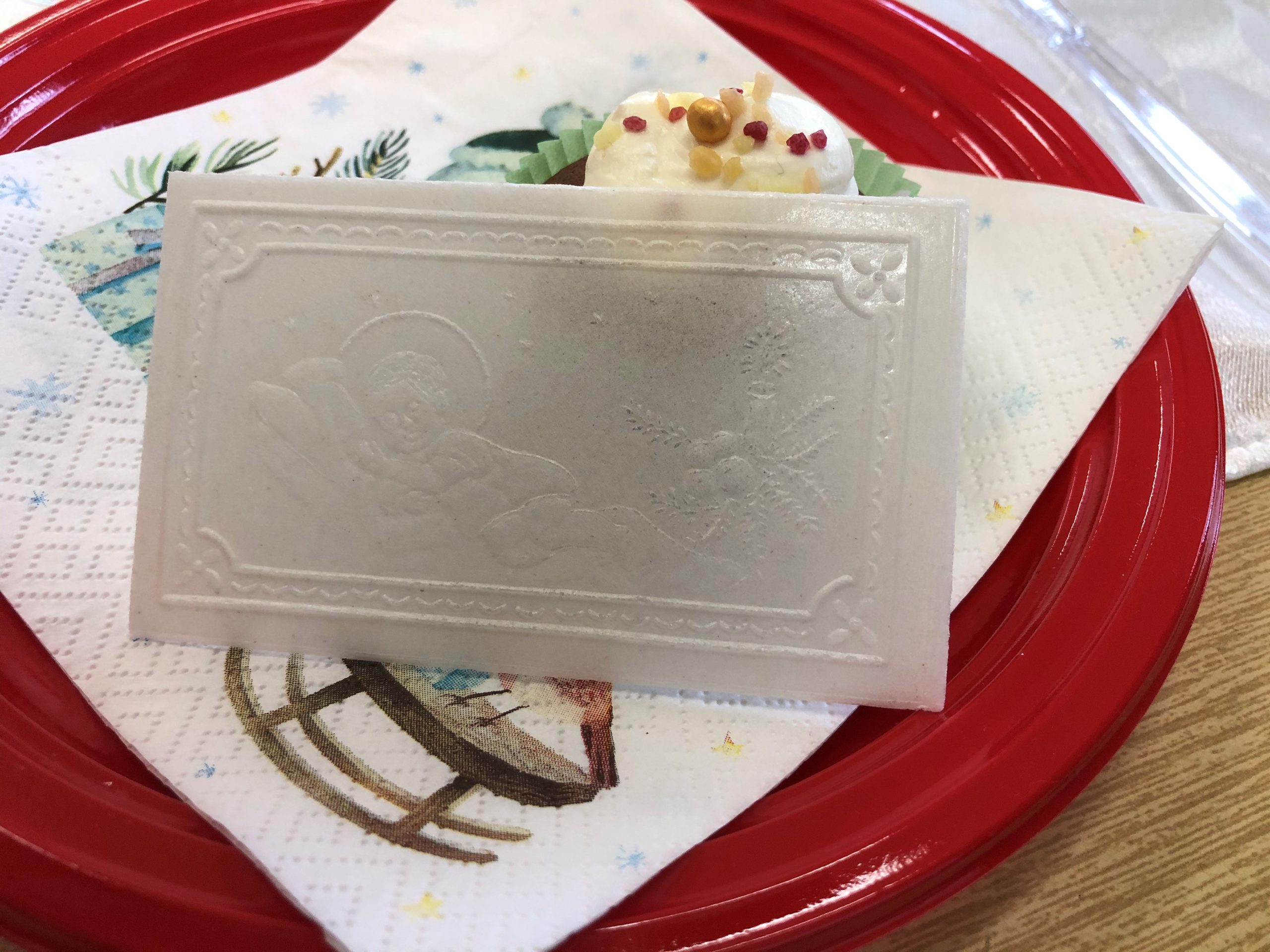 まず、白い薄いクリスマス用のウエハースが配られ、友達一人一人と相手の健康や幸せを祈る言葉を交わした後、お互いのウエハースを少し割って取って食べます。